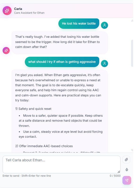 Over time, Carla builds a living picture of what works for your child. You'll start to see correlations for what times or days are particularly rough and what strategies are working. Upload an IEP or BIP to jump start Carla's knowledge about your loved one. Have strict routines? Tell her about it and she can make sure everyone in your circle knows.